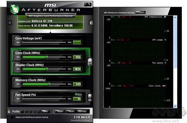 拉動(dòng)滑塊可改變核心頻率,按鍵盤“←”“→”鍵可作逐MHz的微調(diào)。確認(rèn)后點(diǎn)擊下方的“Apply”確認(rèn)設(shè)置。按“Reset”可還原默認(rèn)頻率。