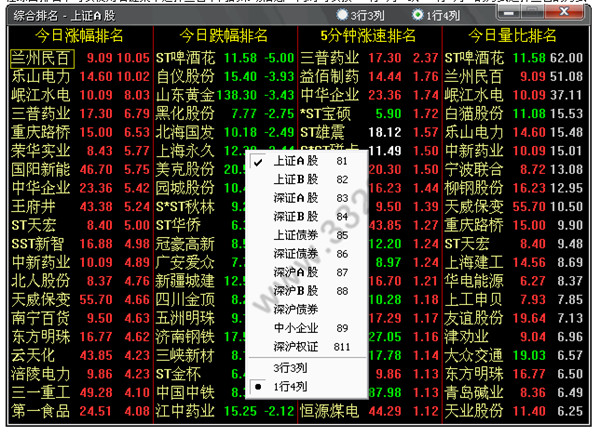 在綜合排名中可以使用右鍵菜單選擇查看不同的市場信息,同時可以按“3行3列”或“1行4列”的方式選擇查看的方式。