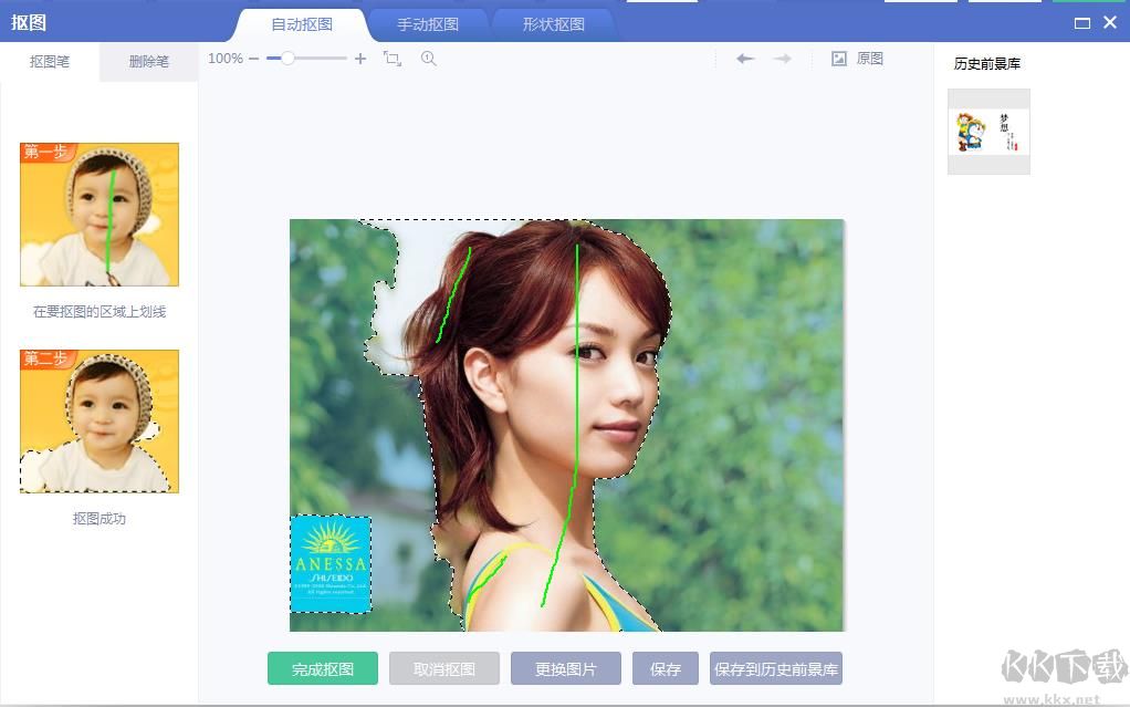 3、左邊有三種摳圖模式供大家選擇,我們先來試試自動摳圖‘,使用畫筆,在要摳圖的區(qū)域畫線就可以了。然后會自動出現選區(qū);