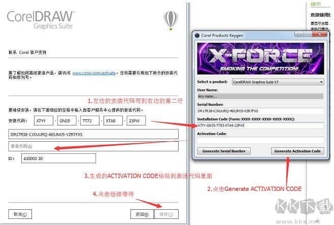 5、已經(jīng)寫到注冊機上后,點擊注冊機的"GenerateActivationCode"按鈕,在ActivationCode下方會出現(xiàn)代碼,復(fù)制到軟件的激活代碼中,然后點擊軟件的繼續(xù)按鈕。