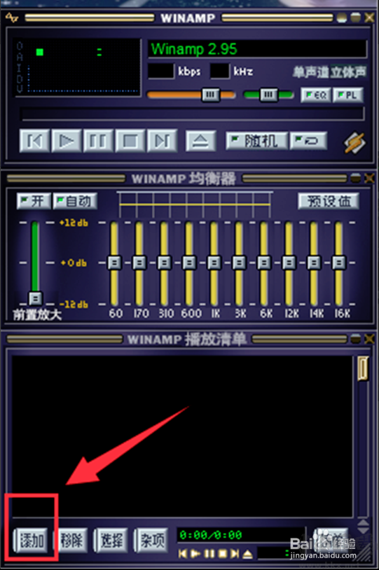 2、在Winamp中點(diǎn)擊左下角的的【添加】選項(xiàng),選擇您要制作歌詞的歌曲進(jìn)行播放。