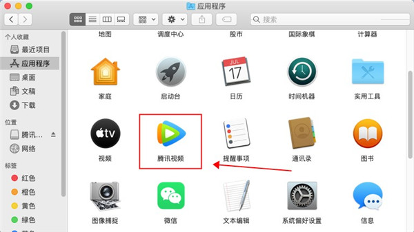 3、之后我們便可以在MacOS自帶的文件管理器的“應(yīng)用程序”欄目中找到我們的騰訊視頻Mac 版,找到它之后我們就可以雙擊打開將它運(yùn)行了