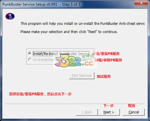 1、選擇Install/Re-Install PunkBuster Service,然后點(diǎn)擊Next