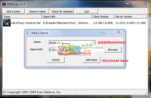 3、接下來(lái)在Game處選擇Battlefield2,然后在Game Path處點(diǎn)擊Browse并選擇你的戰(zhàn)地2根目錄,然后點(diǎn)擊Add Game,如kkx分享的使用圖片所示: