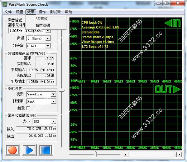 2、打開文件,設(shè)置相應(yīng)的聲音格式,點擊圓圈圖標(biāo)即可開始最基本的聲卡測試
