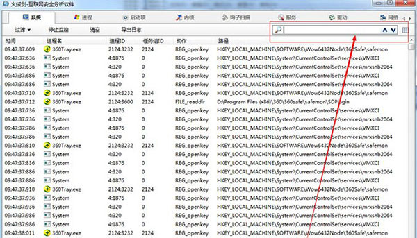 3、如果用戶(hù)需要對(duì)于特定的關(guān)鍵詞進(jìn)行搜索(包括進(jìn)程名、動(dòng)作、結(jié)果等),可以點(diǎn)擊界面右側(cè)的搜索欄進(jìn)行搜索,直接搜索出自己需要的信息進(jìn)行調(diào)用。點(diǎn)擊右邊的↑/↓按鈕可以直接查找上一個(gè)/下一個(gè)相關(guān)的數(shù)據(jù),相關(guān)項(xiàng)目將會(huì)以黃色字體顯示出來(lái)。