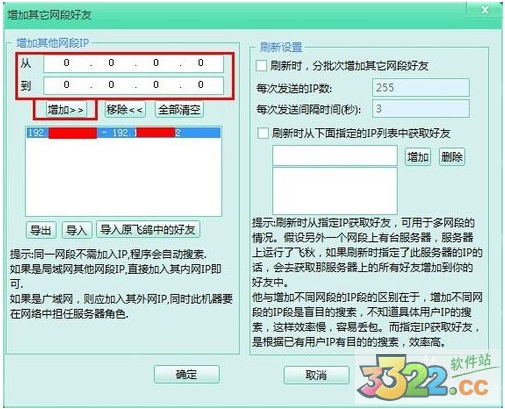 2.在彈出的 增加其他網(wǎng)段好友對話框中,把IP輸入后,點(diǎn)擊【增加】按鈕后,再點(diǎn)擊【確定】