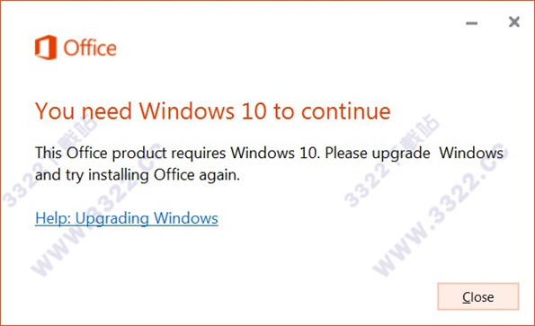 2、其次就是Office 2019專業(yè)增強(qiáng)版要win10系統(tǒng)才能安裝,要是其他系統(tǒng)即會(huì)彈出以下窗口,如kkx分享的圖片: