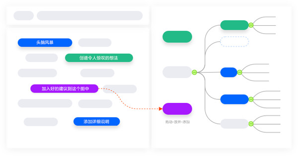 頭腦風(fēng)暴功能可以有效地收集和整理團隊成員的瞬時靈感。只需在左窗格記錄不同顏色的想法,然后將其拖動到右窗格即可生成一張思維導(dǎo)圖,讓想法得以成形。