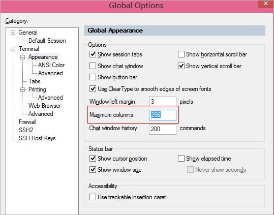 9、大顯示器上若SecureCRT顯示不能占滿整個屏幕,可通過 Global Options/Terminal/Appearance/Maximum columns 來調(diào)整: