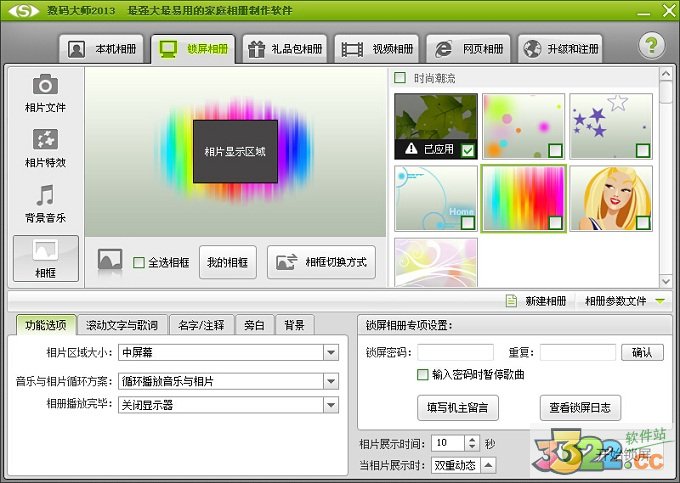 1. 家庭本機(jī)數(shù)碼相冊(cè)制作:“本機(jī)電子相冊(cè)”可以輕松將您喜歡的圖片,數(shù)碼相機(jī)拍出的照片等進(jìn)行數(shù)碼特技處理,配上動(dòng)聽(tīng)的背景音樂(lè)、專業(yè)的切換特效、生動(dòng)逼真的動(dòng)態(tài)藝術(shù)場(chǎng)景、動(dòng)感的鏡頭縮放特效、獨(dú)特的文字與旁白特效、豐富的注釋功能、個(gè)性多彩的藝術(shù)相框和獨(dú)創(chuàng)的MTV歌詞特效等,制造出一流專業(yè)效果的家庭數(shù)碼相冊(cè)。數(shù)碼大師界面數(shù)碼大師界面2. 禮品包相冊(cè)制作:可以在您制作好的本機(jī)電子相冊(cè)基礎(chǔ)上,通過(guò)簡(jiǎn)單的打包設(shè)置,即可自動(dòng)生成可分發(fā)的禮品包相冊(cè),可以作為自己收藏分類相片之用,您更可以作為禮物方便地分發(fā)出去,對(duì)方無(wú)需安裝,即可讓親朋好友共享觀賞您的得意之作!3. 視頻影像文件導(dǎo)出功能(視頻相冊(cè)制作):視頻導(dǎo)出功能可以將您看到的相框內(nèi)所有情景直接導(dǎo)出為VCD/SVCD/DVD甚至是I視頻電子相冊(cè),讓您輕松制作專業(yè)絢麗的視頻數(shù)碼相冊(cè)成為可能。這樣,您便可將制作的相冊(cè)在VCD/DVD或高清BD等影碟機(jī)自由觀賞,而無(wú)需借助電腦,您也可以導(dǎo)出DVD或AVI等高清格式并將視頻相冊(cè)上傳到網(wǎng)上。所有這一切都能讓您的親朋好友不分年齡即可方便地欣賞您創(chuàng)作的動(dòng)感禮物!4. 網(wǎng)頁(yè)數(shù)碼相冊(cè)制作:通過(guò)打包導(dǎo)出為簡(jiǎn)潔的網(wǎng)頁(yè)相冊(cè),您便可將漂亮獨(dú)特的數(shù)碼影集放到互聯(lián)網(wǎng)或直接分發(fā)網(wǎng)頁(yè)的形式,讓世界各地的人通過(guò)上網(wǎng)或直接打開(kāi)瀏覽器立即欣賞您的精彩制作!5. 多媒體鎖屏相冊(cè)制作:只要在制作好的本機(jī)電子相冊(cè)基礎(chǔ)上簡(jiǎn)單選擇,軟件即可自動(dòng)轉(zhuǎn)變成一個(gè)靚麗的多媒體鎖屏系統(tǒng),在您離開(kāi)電腦時(shí),不但可以展現(xiàn)您精心創(chuàng)作的精美個(gè)性相冊(cè),還可以實(shí)時(shí)鎖定視窗并安全保護(hù)您的系統(tǒng),實(shí)現(xiàn)視頻展示、文字留言、密碼保護(hù)等各種先進(jìn)功能,同時(shí)又兼具有屏幕保護(hù)用途,應(yīng)用非常廣泛,是獨(dú)創(chuàng)的全新概念型跨界數(shù)碼相冊(cè)。更動(dòng)感精致、更順滑流暢、更簡(jiǎn)單易用,這就是全新的數(shù)碼大師。一切絢麗優(yōu)雅的專業(yè)效果都在您輕松的數(shù)碼制作中完美實(shí)現(xiàn)