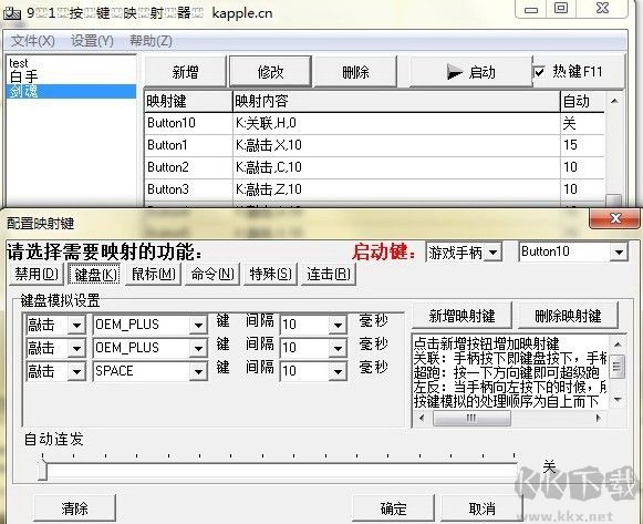 可以將鍵盤或游戲手柄上的一個按鍵映射成一系列組合鍵或鼠標(biāo)動作,當(dāng)按下所設(shè)置的按鍵時,所映射的按鍵或鼠標(biāo)動作就會被模擬發(fā)送,還可以設(shè)置連擊和擊鍵間隔時間,支持游戲手柄,強(qiáng)大易用,速度飛快