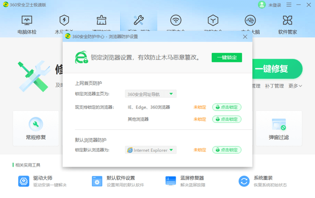 ,360會(huì)提供包括IE瀏覽器、Microsoft Edge、百度瀏覽器、Mozilla Firefox中文版可以選擇并由用戶自己鎖定,主頁(yè)也能夠自定義鎖定,這都是值得點(diǎn)贊的。因?yàn)橐酝谑褂闷胀ò娴臅r(shí)候總是會(huì)偷偷篡改用戶的設(shè)置,讓人感到非常討厭,而這一次360安全衛(wèi)士極速版更人性化了。