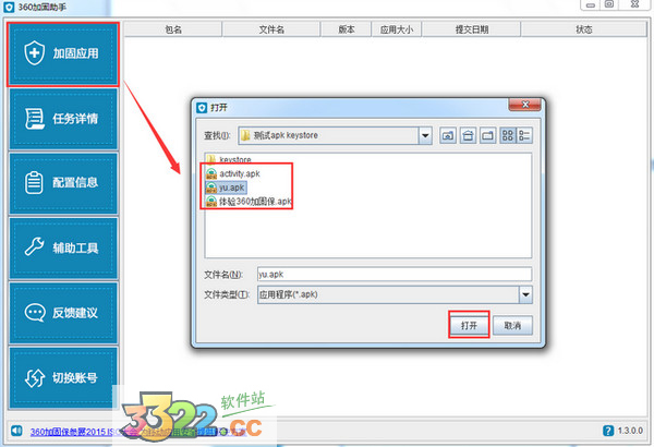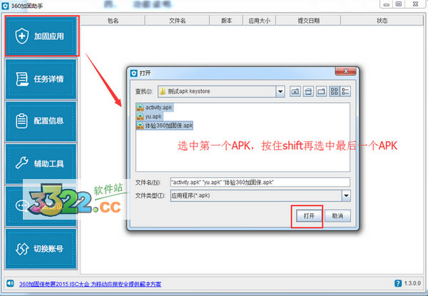 批量加固即一次加固多個(gè)不同APK,共有兩種方法。一是點(diǎn)擊“加固應(yīng)用”按鈕選擇多個(gè)APK,點(diǎn)擊“打開(kāi)”,如kkx小編分享的圖片: