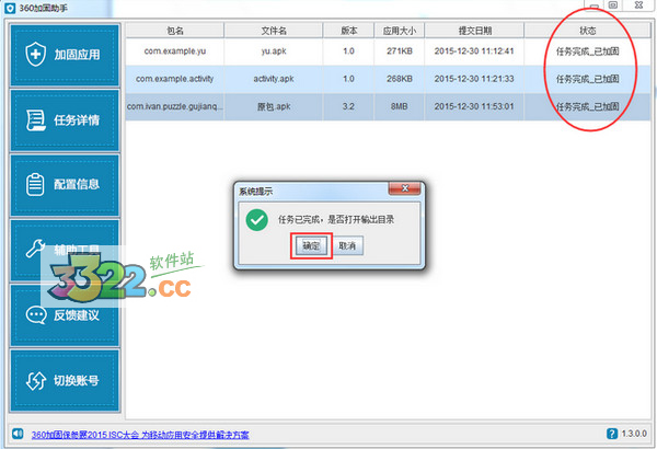 (4)加固完成后彈出提醒框。點(diǎn)擊“確定”打開(kāi)APK輸出路徑,如kkx小編分享的圖片: