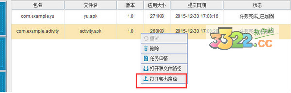 也可在列表里選中任務(wù),右擊鼠標(biāo)選擇“打開(kāi)輸出文件所在路徑”。系統(tǒng)將自動(dòng)打開(kāi)APK輸出路徑,如kkx小編分享的圖片: