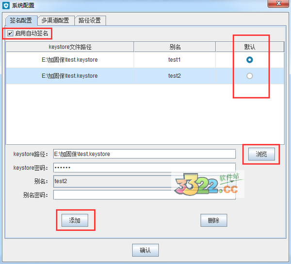 (2)勾選“啟動(dòng)自動(dòng)簽名”,點(diǎn)擊“瀏覽”按鈕,選擇Keystore文件(密鑰倉(cāng)庫(kù)),輸入Keystore密碼,密碼正確后會(huì)顯示別名,然后輸入正確的別名密碼,點(diǎn)擊“添加”,然后單擊“確認(rèn)”或關(guān)閉按鈕即可,如kkx小編分享的圖片:
