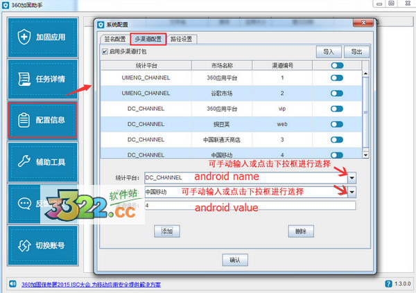 (1)主界面點(diǎn)擊“配置信息”,簽名配置完成后選擇“多渠道配置”,如kkx小編分享的圖片: