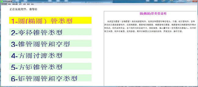 這種類(lèi)型是矩形管.四個(gè)棱錐管和圓管.圓錐管連接的構(gòu)件包括矩形管相交的圓管.四角管與圓管構(gòu)件相交,矩形管與圓錐管相交.斜圓錐管構(gòu)件、四角錐管與正圓錐管構(gòu)件交叉、圓管與四角錐管構(gòu)件直接交叉等6種形式。各部件品種齊全,各部件尺寸齊全.傾斜角度.偏心量可以在一定范圍內(nèi)任意輸入。立體圖附在內(nèi)部.構(gòu)件示意圖.實(shí)例參數(shù).展開(kāi)示意圖和詳細(xì)說(shuō)明,界面友好,操作方便