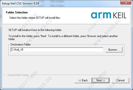 3.選擇安裝位置,默認(rèn)路徑為“C:\Keil_v5”,如kkx分享的安裝截圖: