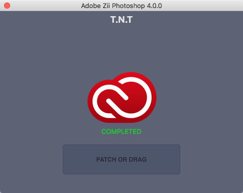3、安裝成功后軟件會(huì)自動(dòng)打開(kāi),先關(guān)閉,然后運(yùn)行破解軟件“Adobe Zii Photoshop.app”,點(diǎn)擊PATCH OR DRAG按鈕,提示完成表示破解成功