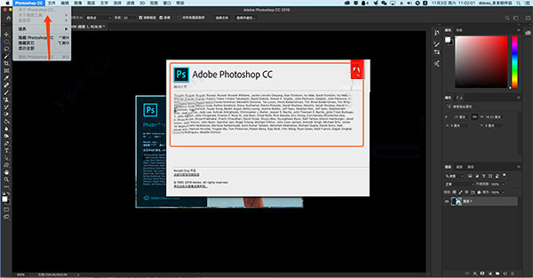 4、至此,ps 2019 mac破解版成功激活,用戶(hù)可以點(diǎn)擊菜單欄上方的軟件標(biāo)識(shí),選擇“關(guān)于 photoshop cc”查看軟件的相關(guān)版本信息