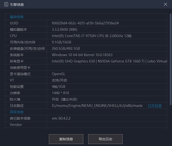 啟動(dòng)運(yùn)行出現(xiàn)異常的游戲,點(diǎn)擊引擎右上角“設(shè)置"、”引擎信息“打開如下圖的界面,點(diǎn)擊底部”復(fù)制信息“即可。