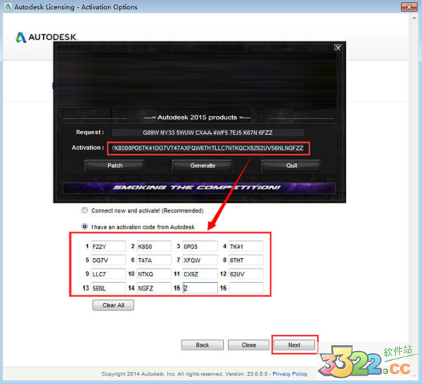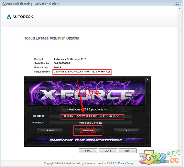 5、將如下圖標(biāo)示的激活碼進行復(fù)制,然后將其粘貼在注冊機的request中然后點擊“generate”,將得到的激活碼進行復(fù)制,如kkx分享的圖片: