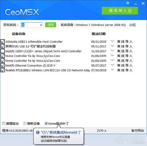 2、所以建議在系統(tǒng)逐漸布署前就導(dǎo)入,也就是你若是在PE下衣GHO,在GHO修復(fù)了就要用CeoMSX導(dǎo)入USB3.0/3.1驅(qū)動(正版系統(tǒng)請使用PE中的安裝專用工具安裝后再導(dǎo)入)。