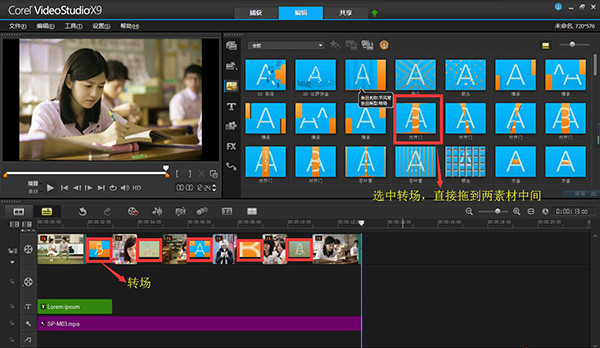 2)、選中其中一個轉(zhuǎn)場,按住鼠標(biāo)左鍵不松手;