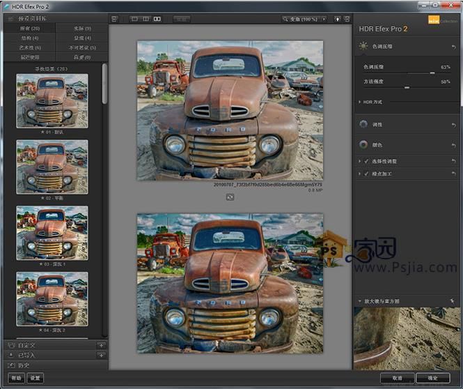 HDR efex pro已經(jīng)內(nèi)置33種HDR效果,并且也可以自己在右側(cè)進(jìn)行HDR細(xì)節(jié)微調(diào)