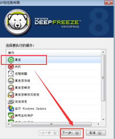 在這個窗口中,您可以選擇需要冰點還原執(zhí)行的任務,包括重啟、關機、遠程喚醒等多種任務均可選擇??呻p擊任務直接進入下一步,也可以單擊任務后點擊“下一步”繼續(xù)。