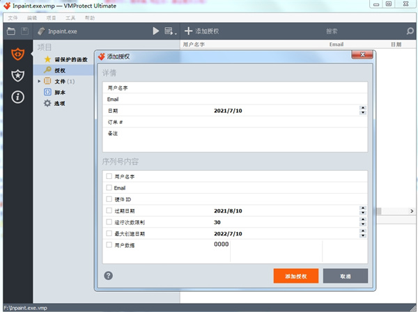 vmprotect的Professional和Ultimate版本擁有一個(gè)控制面板版本,適用argv,并且可以從自動(dòng)構(gòu)建環(huán)節(jié)中應(yīng)用。該版本徹底適用腳本制作、水印、序列號(hào)和VMProtect的全部別的功能。