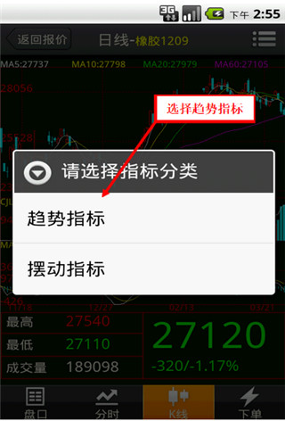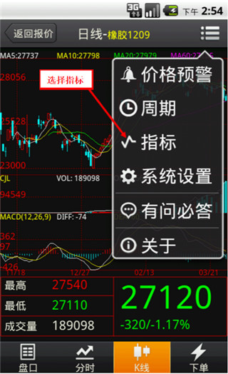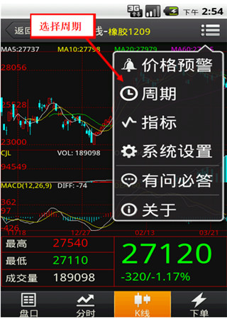 在k線圖界面點(diǎn)擊標(biāo)題欄右側(cè)的菜單按鈕。如下圖