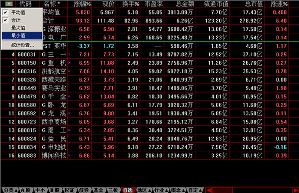 2、行情報(bào)表中支持股票集合的"統(tǒng)計(jì)"功能(點(diǎn)擊最左上角的按鈕)