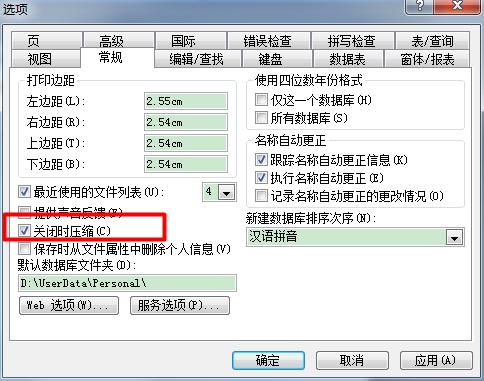 3、勾選“關閉時壓縮”復選框,單擊“確定”按鈕使設置生效;