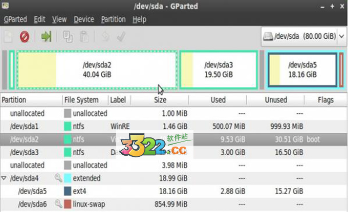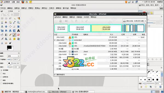 6、進到gparted,就能發(fā)現(xiàn)和瘟到死的PQ相近的界面,操作過程也是一樣的,并且也適用瘟到死分區(qū)的調(diào)整