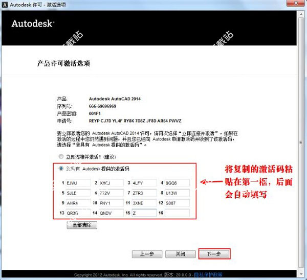 9、激活AutoCAD2014,粘貼激活碼的時候,只需要選中第一個輸入框,然后粘貼即可。所有的激活碼會自動填充