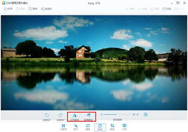1)在圖片處理窗口,在工具欄點擊“旋轉(zhuǎn)”按鈕,就可以看到水平翻轉(zhuǎn)、垂直翻轉(zhuǎn)。