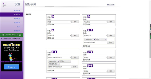 2、鼠標(biāo)手勢(shì)的設(shè)置:前面的設(shè)置可以默認(rèn),往下拉可以看到非常多的手勢(shì)設(shè)置,每個(gè)手勢(shì)都可以自定義功能,可以由使用者盡情發(fā)揮,不過不設(shè)置也可以,按照默認(rèn)配置即可