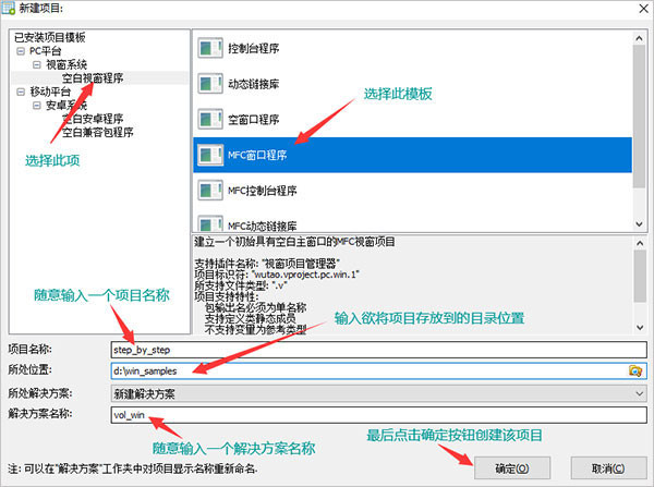 3、啟動(dòng)火山平臺(tái)后,點(diǎn)擊執(zhí)行“文件->新建->項(xiàng)目”菜單功能,并在左側(cè)“已安裝項(xiàng)目模板”樹形框中選擇“空白視窗程序”,右側(cè)列表框中選擇“MFC窗口程序”,以此輸入項(xiàng)目信息,如kkx分享的截圖: