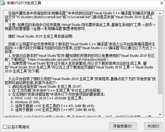 注意:因?yàn)橐暣捌脚_(tái)會(huì)把用戶的火山程序編譯為C++語言源程序,然后轉(zhuǎn)交給C++本地編譯器去進(jìn)行編譯,因此需要系統(tǒng)中安裝有微軟公司的VC編譯器,如果您的系統(tǒng)中尚未安裝,則啟動(dòng)編譯時(shí)將會(huì)自動(dòng)提示安裝,如kkx分享的截圖: