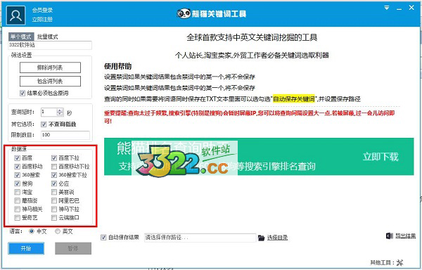四、完成勾選點(diǎn)擊開始即可,現(xiàn)在熊貓關(guān)鍵詞工具箱就會(huì)幫助用戶自動(dòng)搜索相應(yīng)的關(guān)鍵詞啦
