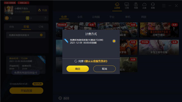 2、登錄完成后即可進(jìn)入軟件首頁,軟件提供15分鐘的免費(fèi)體驗(yàn)時(shí)長,您可以選擇免費(fèi)、然后點(diǎn)擊開始連接即可連接到云計(jì)算機(jī)進(jìn)行體驗(yàn)。
