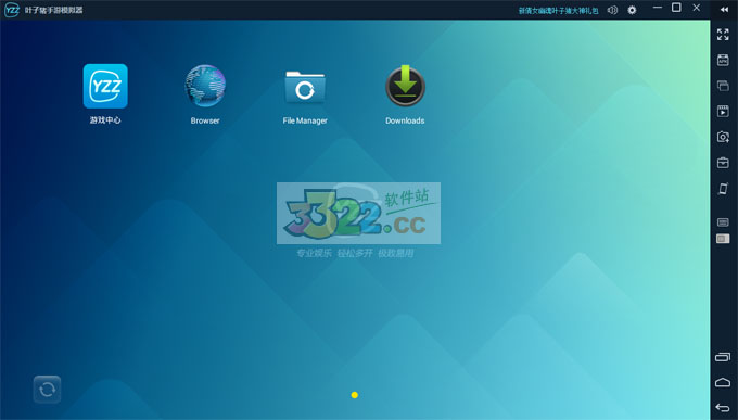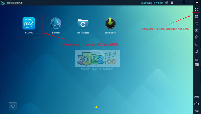 2.進入模擬器的主界面后,如果是安裝已經(jīng)下載好的數(shù)據(jù)包,點擊屏幕右側(cè)的apk圖標就可以進行安裝。“游戲中心”也可以一些來自葉子豬官網(wǎng)的游戲資源,下游戲的話也可以在這里下載。