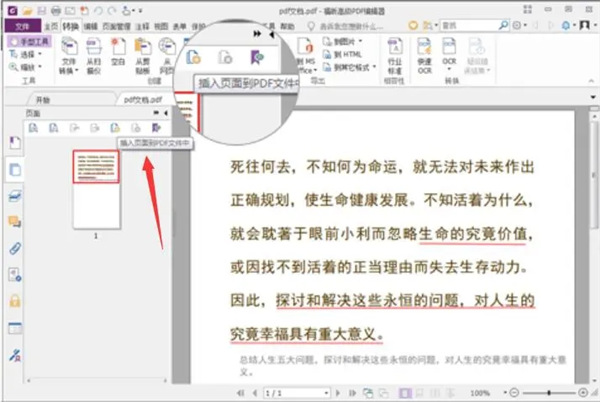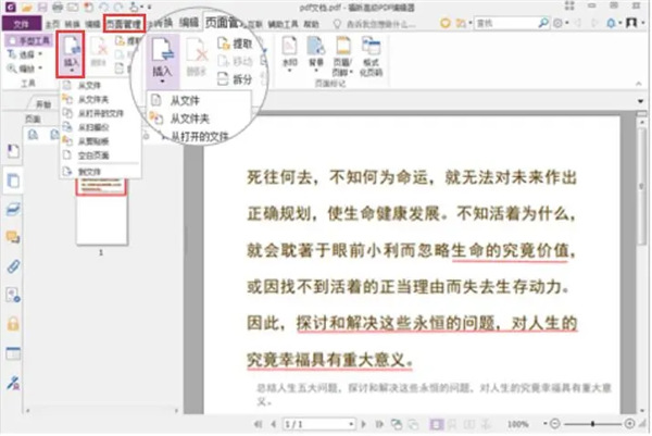4、或者,你也可以點(diǎn)擊福昕高級 PDF 編輯器菜單欄中的“頁面管理”,在其功能欄中點(diǎn)擊“插入”,再從“插入”子菜單中選擇需要合并的 PDF 并進(jìn)行排列。