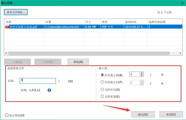 5、在福昕高級 PDF 編輯器彈出來的插入頁面的設(shè)置中,用戶設(shè)置需要合并的 PDF 具體的展現(xiàn)位置,設(shè)置完成后,點(diǎn)擊“確定”按鈕。