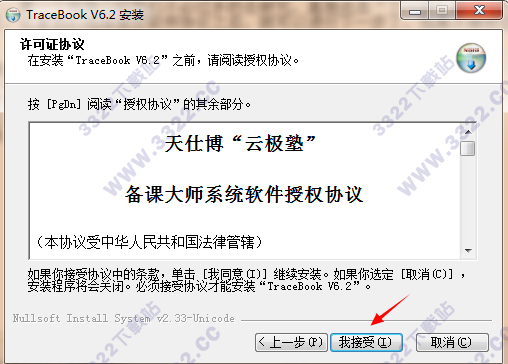 3、然后詢問是否接受軟件的安裝協(xié)議,這里我們選擇接受軟件協(xié)議之后,就可以進(jìn)行下一步了,如果不接受這個協(xié)議,將無法進(jìn)行下一步的安裝步驟