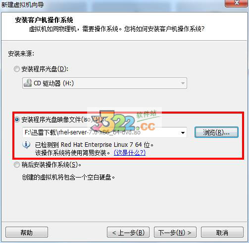 2、將我們的ISO映像文件選中,這種方式是簡易安裝,會安裝英文的桌面redhat linux 7.0,如果想要自己動手安裝選擇稍后安裝系統(tǒng),而第二種方法和我們的U盤安裝一樣,選擇自定義安裝的用戶可以逃過這里看下面的U盤安裝。