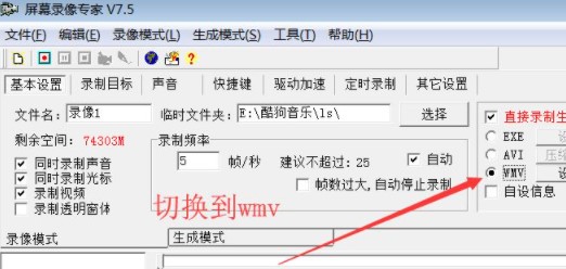 1、打開軟件,在“基本設(shè)置”中,最右邊,選擇錄制生成的格式為“wmv”。